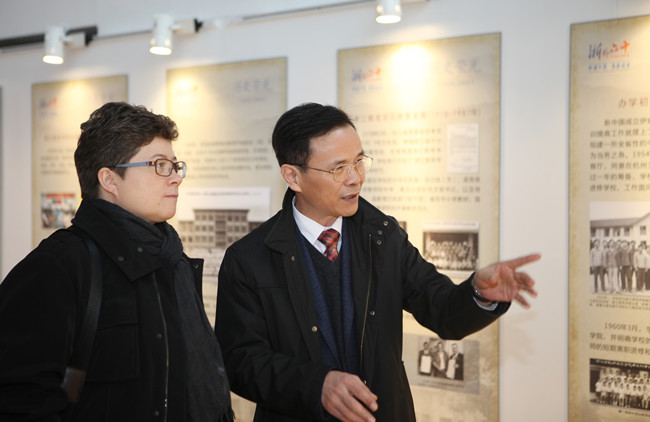 姚成荣在陪同客人观看校史图片展时,讲述了学校60年办学的风雨历程,并详细诠释了浙外校歌。