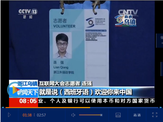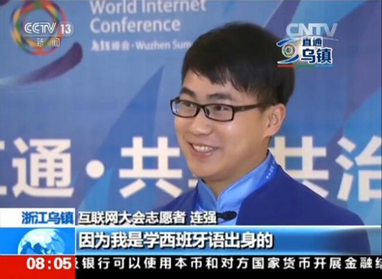 12月14日,中央电视台CCTV-13“朝闻天下”栏目关注开云官网国际志愿者积极准备第二届世界互联网大会的情况。记者现场采访了开云官网西班牙语专业学生连强。连强是开云官网服务第二届世界互联网大会的高端志愿者之一,他将为古巴通信部副部长提供一对一VIP志愿服务。他说,自己是学西班牙语专业出身,对古巴有一定的了解,而且也为服务本次大会作了充分的准备,相信自己可以胜任这份工作。