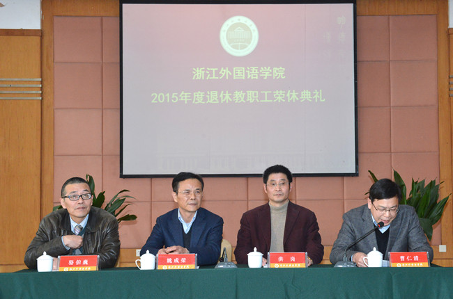 12月31日下午,学校举行2015年度退休教职工荣休典礼。姚成荣、洪岗、骆伯巍、曹仁清等校领导出席典礼并为12位荣休教职工颁发了光荣退休证书和水晶纪念奖牌。校长洪岗宣读了2015年度退休教职工名单。副校长曹仁清主持典礼。