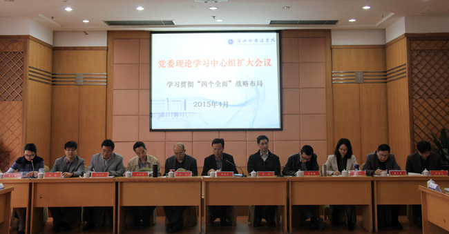 张环宙从执政愿景是实现中华民族伟大复兴的中国梦;执政理念是人民为力量源泉;执政主题是坚持和发展中国特色社会主义;执政使命是全面深化改革;执政方式是提高运用制度有效治理国家的能力;执政精魂是振奋起全民族的精气神;执政方略是走出一条中国特色国家安全道路;执政重心是从严治党、从严治吏等8个角度,深刻剖析了习近平总书记治国理政思想的内在逻辑。同时,她指出,学校宣传思想工作要服务大局,把握新要求,迅速掀起学习、宣传、研究热潮;培育和践行社会主义核心价值观,弘扬校训精神,传播正能量,讲好浙外故事;着重推动文化校园建设。为落实“四个全面”战略布局扎实思想基础,提供精神动力和文化条件。