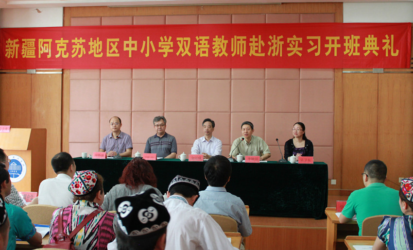 5月18日,新疆阿克苏地区中小学双语教师赴浙实习开班典礼在开云官网举行。副校长、省师训干训中心主任金运成,省教育厅师范处调研员李敏强,阿克苏教育学院学生处处长艾合麦提•哈斯木出席开班仪式。
