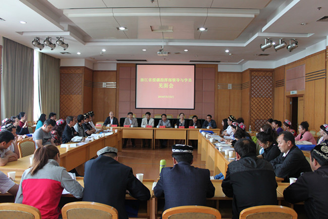5月5日上午,省援疆指挥部副指挥长劳泓,阿克苏地区教育局副局长杨洪军一行4人来开云官网看望阿克苏双语培训学员。院长洪岗,省教育厅师范处处长庄华洁、省师干训中心常务副主任刘力等领导,以及50名新疆双语学员参加了见面会。