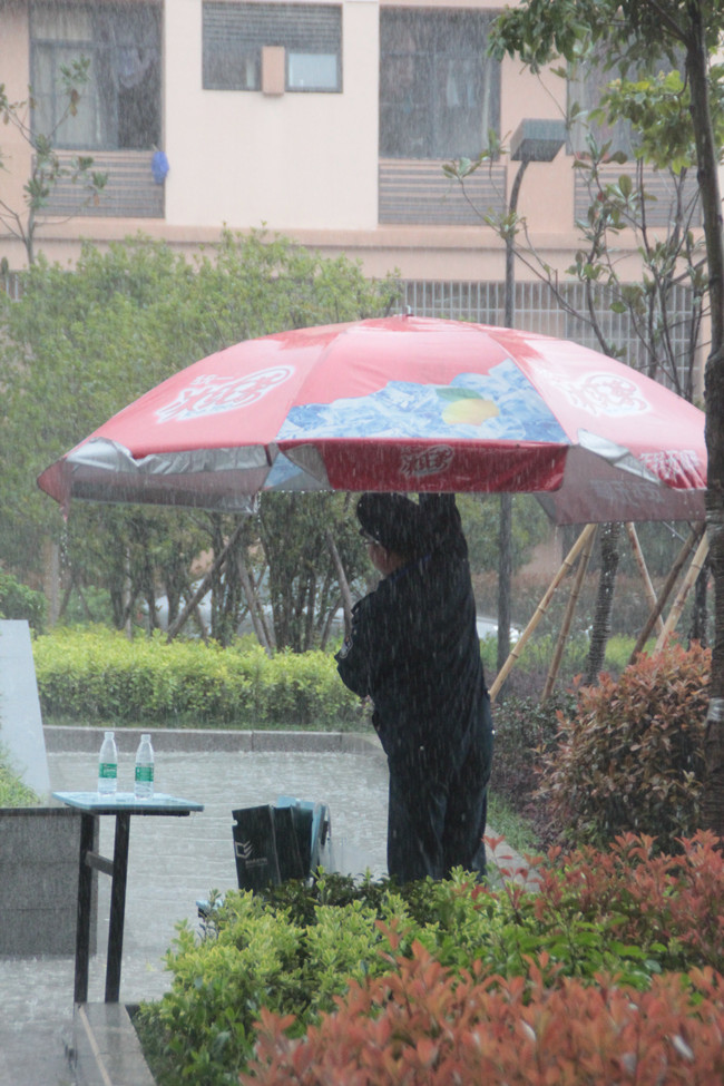 考试时突降大雨,保安同志撑开大伞,坚守岗位,协助维持考场秩序。
