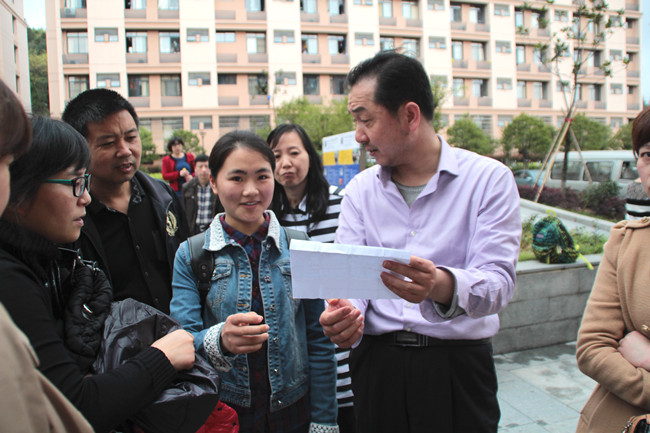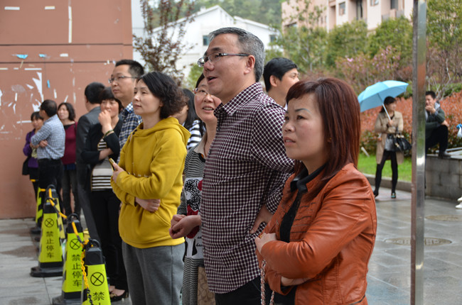 考试前,一对家长和孩子沟通交流以克服紧张情绪,引得其他家长也来围观。