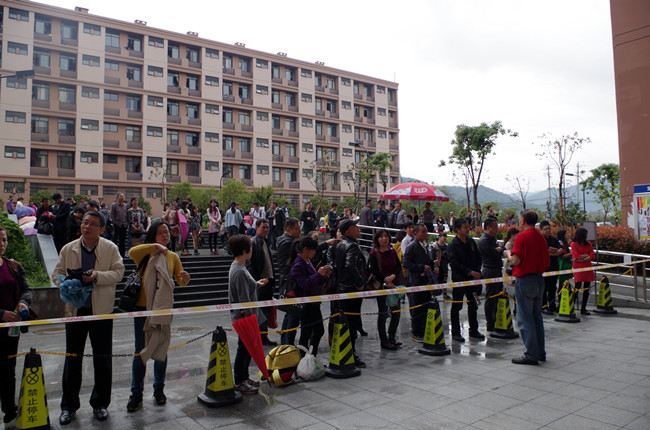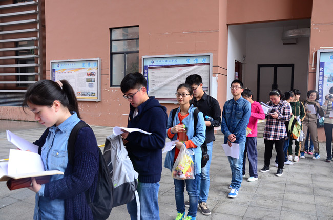 考生们等待报到抽签时也不忘悉心准备,认真的他们站成一道风景。
