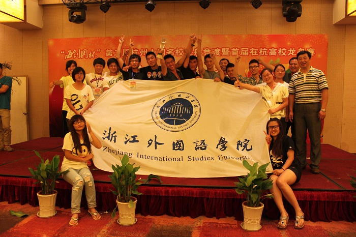 “浙外龙舟,气势如虹,西溪赛场,一展雄风”。6月23日下午3点左右,由宋国海、童杰老师任教练,蒋建冬、俞丽红、宋贝贝等15位同学组成的龙舟队,以4分15秒的好成绩获得在杭高校龙舟赛第一名。这一成绩甚至比C9名校专业组第一名成绩还快20秒。