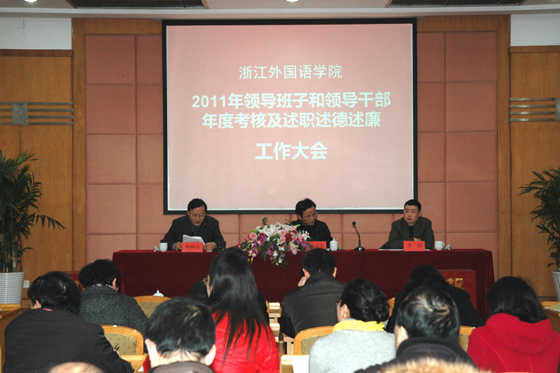 为更好地实施高校领导班子和领导干部年度考核制度,落实省委组织部今年开始对领导干部德的情况考核考察评价的要求,促进领导干部认真履行职责,廉洁奉公,加强党性修养和作风养成,3月8日下午,2011年度学校领导班子和领导干部考核工作及述职述德述廉会议在芳草苑多功能厅召开。省委组织部干部三处副调研员章坚同志到会指导。会议由党委书记姚成荣主持。