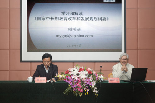 4月20日下午,国内知名教育家、中国教育学会会长、北京师范大学博士生导师顾明远教授来校作题为“学习和解读《国家中长期教育改革和发展规划纲要》”的学习辅导报告。顾先生作为《国家中长期教育改革和发展规划纲要》制定的参与者,在两个多小时的辅导报告中,他科学分析了《规划纲要》产生的背景,详细介绍了《规划纲要》制定过程和指导原则,重点阐述了《规划纲要》关于总体战略、发展任务、体制改革和保障措施等四个方面的基本内容。
