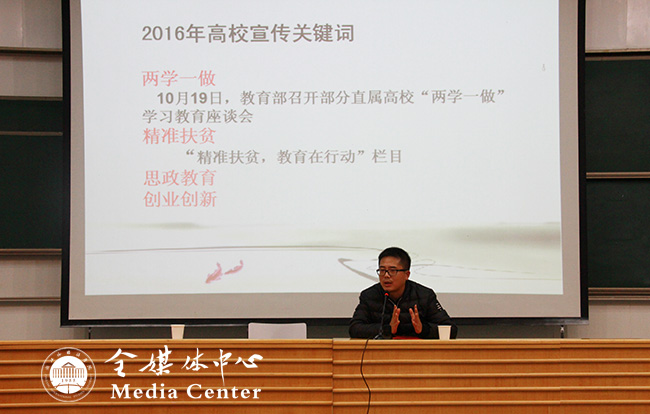 讲到关心教育大事时,蒋亦丰强调,坚持正确的舆论导向,弘扬主旋律,这是教育专业媒体的责任和义务。做好宣传工作,就是在推进学校的教育工作。要勇于把握教育热点,占据宣传的制高点。蒋亦丰结合这两年教育新闻的特点,指出学校外宣工作要突破必须抓好教育关键词:“创业创新”“思政教育”“两学一做”“精准扶贫”。“紧抓这些关键词,开展形式新颖的活动,高校的宣传工作大有文章可做。如果你们吃透这些概念,运用到自己的文章中,将会收获不一样的效果。”至于社会焦点,蒋亦丰则从“趁热打铁”“雪中送炭”两个角度出发,讲述了将社会热点与高校新闻结合的技巧。同时向在场师生指出了新闻热点要及时跟进,“切口”要小,牢记多细节、多故事、少“工作”这三个撰稿注意点。