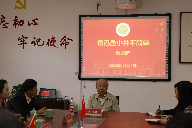 詹永新就香港情况做了主题为“香港虽小但不简单”的专题报告。他以自身丰富的阅历和曾担任外交部港澳台司司长的经历,从香港的重要性、复杂性和现有国际形势下面临的问题等方面作了深刻论述。专题报告内容详实,语言生动,深入浅出。中心老师们也积极向詹永新大使提问交流,现场氛围热烈。