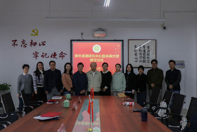 学校资深教授、国别和区域研究中心主任、北京第二外国语学院原校长周烈为詹永新颁发聘书。周烈对詹永新先生的到来表示热烈欢迎和衷心感谢。他介绍了港澳研究中心成立的背景、基本情况和已开展的工作,表示在詹永新先生的参与指导下,定能帮助中心进一步指明港澳研究方向,促进浙外港澳研究中心稳步发展。