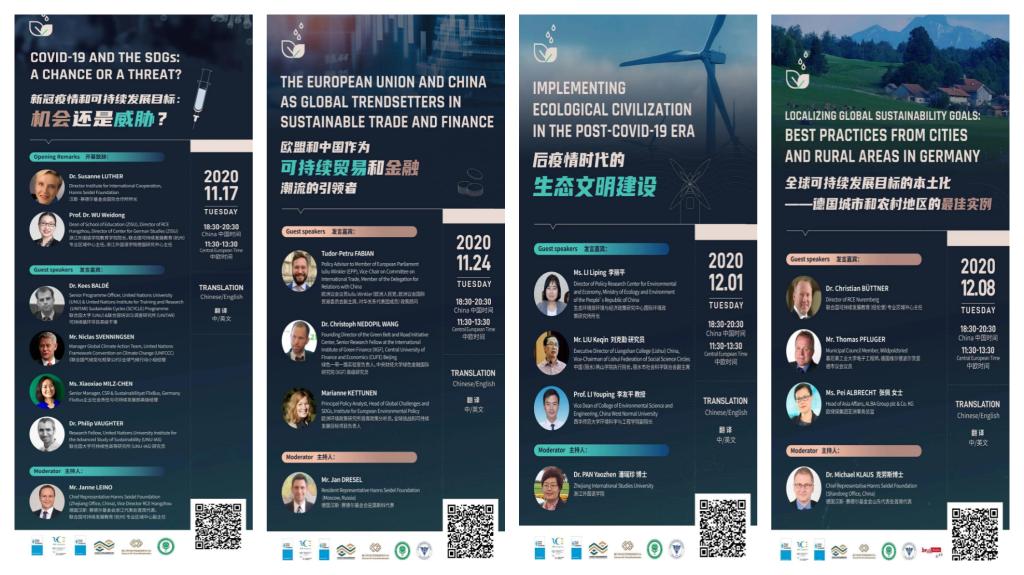 自11月17日起,每周二晚18:30于线上会议平台举办研讨活动,分别围绕“新冠疫情和可持续发展目标:机会还是威胁?”“欧盟和中国作为可持续贸易和金融潮流的引领者”“后疫情时代的生态文明建设”“全球可持续发展目标的本土化——德国城市和农村地区的最佳实例”等四个主题展开讨论。研讨会内容立足全球视野,探讨政策、经济、科研等方面的可持续发展对策。