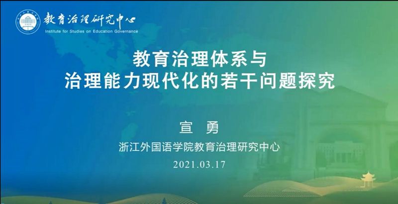 3月17日晚,校党委书记宣勇教授应邀作题为“教育治理体系与治理能力现代化的若干问题探究”的钉钉线上讲座,该讲座是面向该院2018级小学教育专业学生开设的“教育理论前沿讲座”课程首讲。讲座围绕“为什么要强调教育治理现代化、教育治理现代化化什么、教育治理现代化怎么化”这三个问题条分缕析,层层深入,为学生们打开了探索教育治理体系与治理能力现代化之门径。