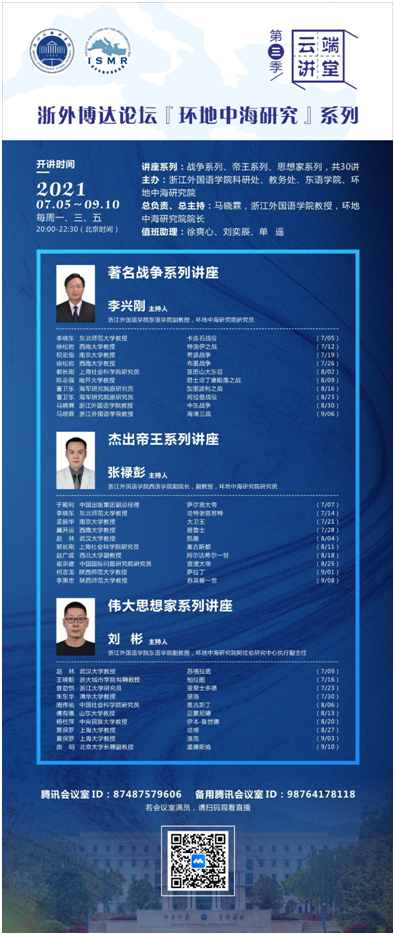 云端讲堂第三季由浙外科研处、教务处、东语学院、环地中海研究院联合主办,是迄今为止国内规模最大的“环地中海研究系列”讲座,旨在构建中国“环地中海学”研究,同时以学术成果更好地服务社会。