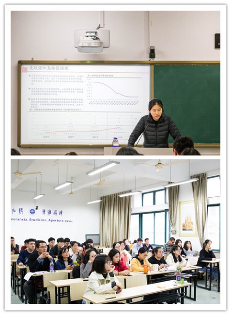 讲座中,刘维迪博士深入浅出、旁征博引,分析了全球经济态势,梳理了“中美贸易战”的背景、进展和影响,回顾了2018中国经济发展,预测了2019年经济中增长着力点等。王樾经理则凭借深厚的理论素养和丰富的工作阅历,着重剖析了证券市场投资策略。聆听讲座的师生们受益匪浅。