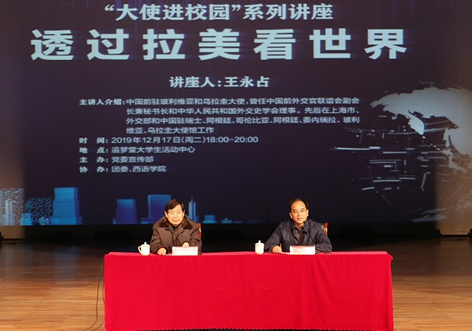 “要做好中国的事情,就要了解世界。”“世界多极化,经济全球化,文化多样化,社会信息化,无论世界风云如何变幻,和平与发展仍然是当今世界的主题。”初冬的夜晚,浙外追梦堂里暖意浓浓,台上娓娓道来,台下求知若渴,莘莘学子对拉美文化充满好奇,对那片土地上的故事兴趣盎然。12月17日,中国前驻玻利维亚、乌拉圭大使王永占,受邀做客德雅讲堂第32讲,作了题为“透过拉美看世界”的专题讲座。讲座前,校党委副书记赵文波会见来宾,并对大使来校授课表示欢迎和感谢。党委委员,党委组织部、统战部部长,党委宣传部部长徐勇主持本次讲座。