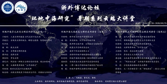 受新冠肺炎疫情影响,为帮助大家洞察外部世界,特别是古代人类文明聚集、当代地缘博弈叠加的环地中海地区,浙外环地中海研究院经过精心策划,“化危为机”,与学校科研处、东语学院共同主办国内迄今最大规模的系列云端学术讲座。该讲座从7月20日至9月25日,每周一、三、五20:00至22:00,邀请全国知名专家学者和具有研究特色的青年学者,围绕“环地中海历史文明”、“环地中海大国政策与博弈”、“环地中海热点问题和国家治理”三大板块,上下七千年,纵横近万里,系统梳理和辨析地中海及周边世界关系,带领大家立足中国看世界,酷暑激浪地中海,隔空触摸三大洲,享受豪华的知识、思想系列晚宴。