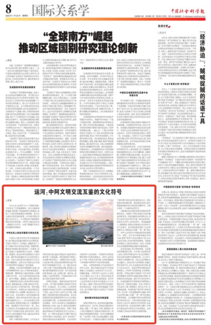 1月23日,中国社会科学报国际关系学版(8版)、中国社会科学网刊发开云官网阿拉伯研究中心副研究员侯眷老师的理论文章《运河:中阿文明交流互鉴的文化符号》。