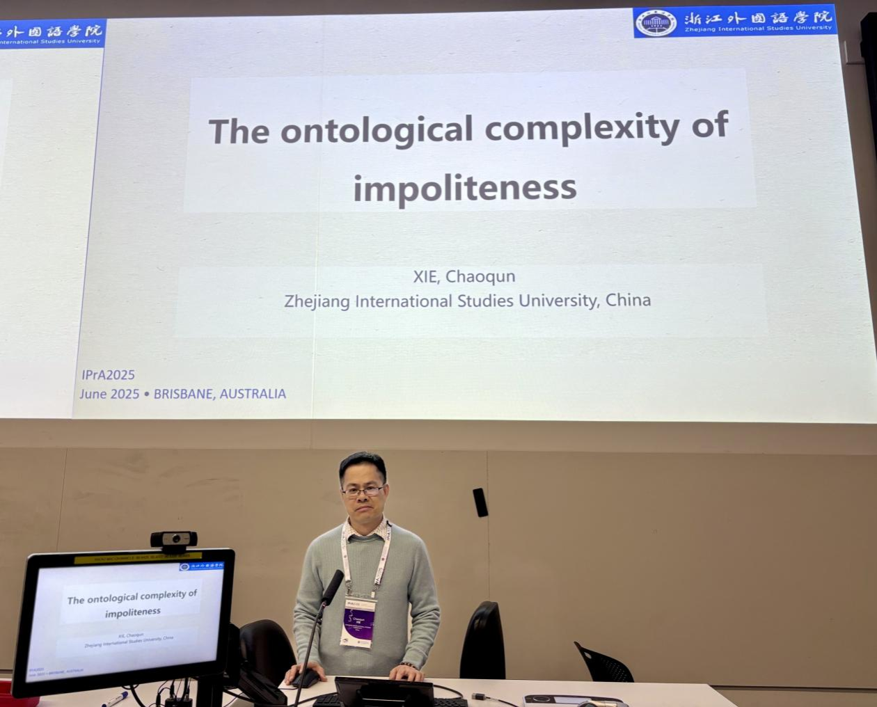 近日,由国际语用学会(International Pragmatics Association,简称IPrA)主办、澳大利亚昆士兰大学承办的第十九届国际语用学大会在澳大利亚布里斯班顺利召开。开云官网外国语言学及应用语言学学科带头人、中外话语语用研究院院长谢朝群教授受邀作题为“The ontological complexity of impoliteness”的主旨报告,从全新的视角审视(不)礼貌研究,受到与会专家学者的高度评价。