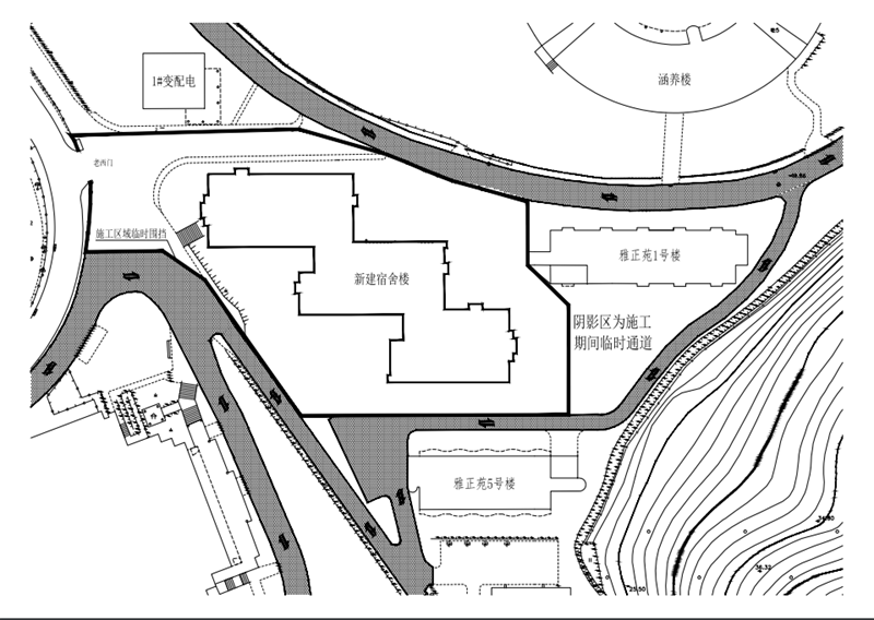 1.本工程将进行全封闭施工,学校部分道路将纳入施工区域内,目前学校已在学生宿舍雅正苑1号楼南侧修建人行便道方便师生日常通行,具体见附图。