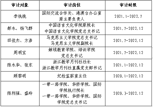 受校党委组织部委托,根据《kaiyun开云官方中层领导干部经济责任审计实施细则》(浙外党办﹝2022﹞11号)的有关规定,我处成立审计组,自2023年5月22日起,对部分中层领导干部(或原中层领导干部)进行经济责任审计,具体名单如下: