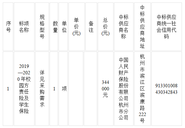 关于 kaiyun开云官方 2019—2020年校园方责任险及学生保险的中标(成交)结果公告