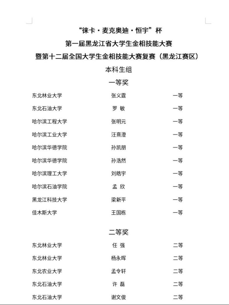 6月9日至6月11日,由黑龙江省普通高等学校创新创业教育指导委员会主办、哈尔滨理工大学承办的第一届“徕卡・麦克奥迪・恒宇”杯黑龙江省大学生金相技能大赛暨第十二届全国大学生金相技能大赛复赛(黑龙江赛区)在哈尔滨理工大学材料科学与化学工程学院举办,来自哈尔滨工业大学、哈尔滨工程大学、哈尔滨理工大学、东北林业大学、东北石油大学等省内13所高校近200名选手参赛。在双创学院和教务处的大力支持下,经过校赛严格筛选,beat365共派出9名参赛选手,其中本科生6人,研究生3人。最终经过激烈的角逐,beat3659名参赛选手全部获奖。本科赛道获得一等奖1项(焊接技术与工程21-2班梁新平),二等奖5项(焊接技术与工程21-2班吴玉成、材料成型及控制工程20-2班牟鹏博、金属材料工程20-1班芦军、金属材料工程20-1班覃福任、金属材料工程20-2班陈强);研究生赛道获得一等奖1项(研22-12班张宇豪),二等奖1项(研22-12班胡金),三等奖1项(研22-12班齐佰良)。beat365获得优秀组织奖。