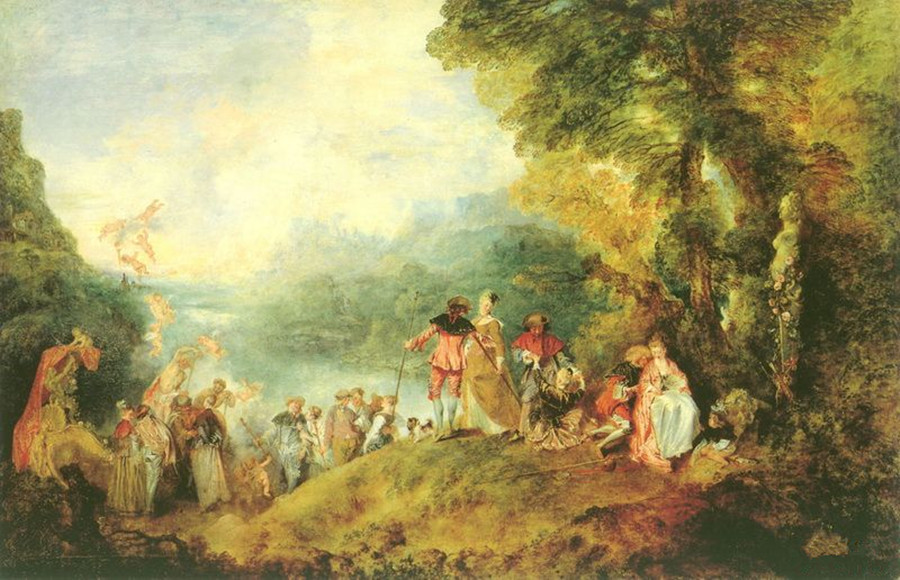 这里的构图是一个充满诱惑的幻景,所绘的大自然也充满诗意。金色的霞光普照大地,这些贵族情侣在等待依次登上缀满鲜花的彩船,他们是那样迫不及待,有的早在相互搂抱,有的忙着挤上去。灿烂的阳光清楚地显现出这些醉生梦死的贵族男女的调情动作,尽管这些人物在整幅画上的比例较小。远处待发的船帆,更点醒了这幅画的主题。