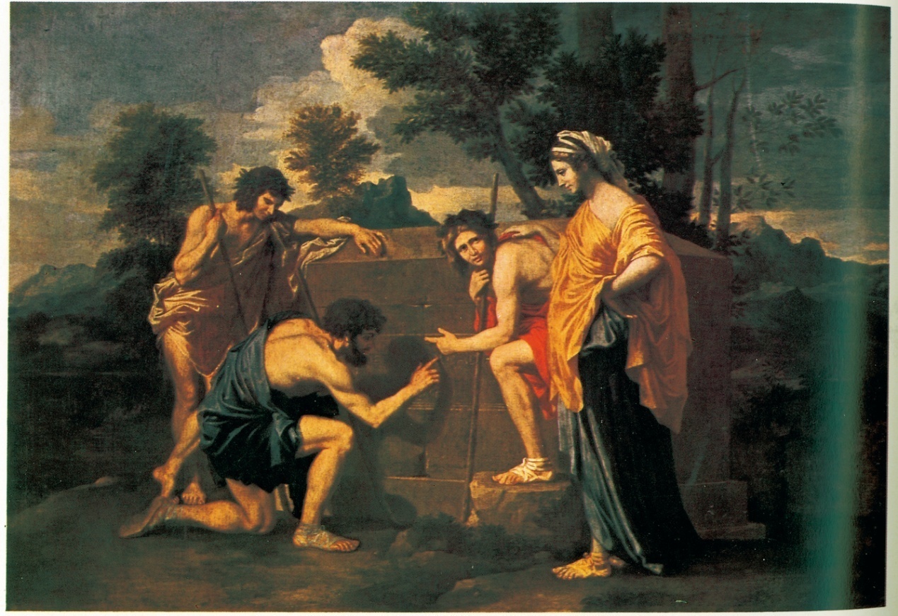 据美术史学家解释,这个“我”指的是“死神”,整个画面表现的是对“死亡”的讨论和思索。不过整幅画的基调是宁静优雅的,使人丝毫感觉不到死亡的可怕。”显然,这是一种“风光虽好,人生苦短”的感叹。我们从左侧一个伏在墓顶上的牧人的表情看,他低着头,似有缅怀之情,与左边站立着的女牧人形成对比。女牧人身着黄衣蓝裙,是全画最跳突的色彩。这个女性形象费人猜思,据说,她是美好人生的象征。她虽含颌垂首,默默倾听着铭文,却给人以一种抚慰感。疑虑与抚慰,惆怅与哀思,围绕着一个人生的哲理问题,让人紧紧思索。这里的女牧人与男牧人构成了形象化的一种情绪对比。似乎隐隐地在向观者表白:“死何足惧?阿卡迪亚毕竟是世人的向往之地。”这种非现实的牧歌式悲凉情调,在一定程度上,表露了画家当时的处境与对艺术的憧憬。画上人物的服饰都是仿效希腊雕刻风格的。他始终把这种形象视为艺术的崇高表现。不过对于西方人来说,也许确能发思古之幽情。