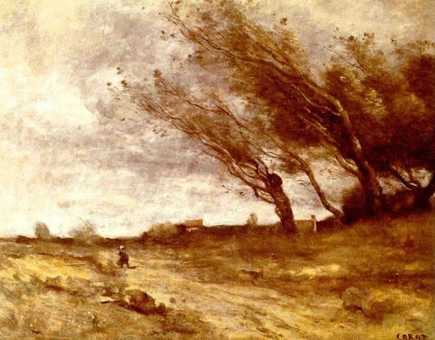 作品简介:画中,一棵巨大的树,占据了整个画面的二分之一,而另一棵干枯的树与之遥相呼应,两棵树朝着一个方向倾斜着。透过倾斜的树干,我们看到,清澈如镜的湖面上,有连绵起伏的山峦和丛林的虚影。一个身穿红色衣裙的妇女,正在采树上的蘑菇,她的身边有两个女孩在帮她一起采摘。画面情节很简单,但是你能从柯罗纤细的笔触上,听到柔弱的树枝,发出的瑟瑟响声;能从倾斜的树干上,想到山区的农妇,生活是何等困苦。