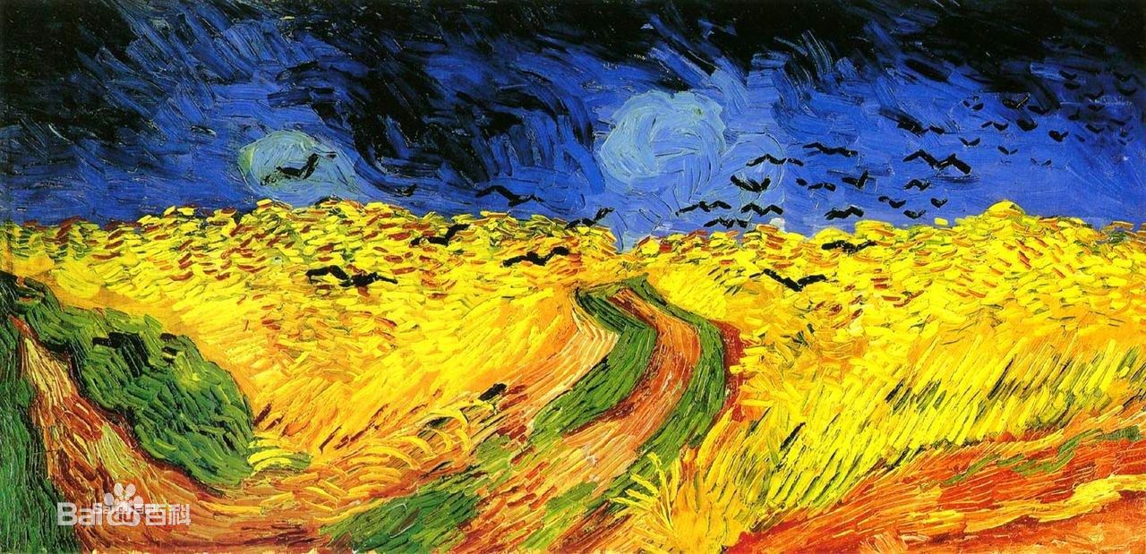 作品寓意:《麦田上的群鸦》是荷兰后印象派画家文森特•威廉•梵高创作于1890年7月的一幅油画。通常的解释是,这幅画是以黑暗,严酷的天空显示了梵高的精神状态的困扰,与徘徊不决的通往不同方向的三种途径,与黑色乌鸦架空的预示死亡迹象。画家写道,他曾在三幅画里画过瓦兹河畔欧韦大片的麦田与多事之秋的天空。