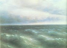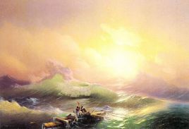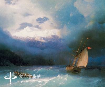 作品简介:这幅画描绘的是海上惊涛骇浪的险恶场面,既充满着恐惧,又极富浪漫主义色彩,像一首情绪高昂的诗。这是 画家靠自己惊人的记忆力和对海的深刻理解而完成的。因此他所有的海景大多是真实与想像相结合的产物,画家本人因擅长画海而被称为“海空上的第一颗明星”。1974年3月30日,前苏联发行了一套六枚的《俄罗斯海景画家艾瓦佐夫斯基绘画》的绘画邮票,其中第四枚就是这幅《狂暴的海涛》的绘画。