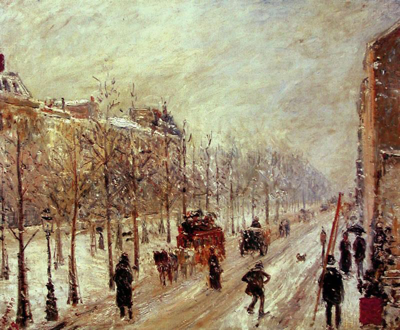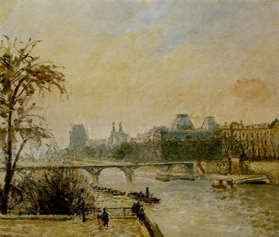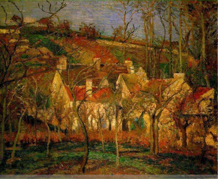 在深秋接近冬季的乡村画面上,毕沙罗让阳光爬满了每一根树枝,每块空间,到处都闪耀着斑斓的色光。使人感到在寒冷的季节透出了浓浓的欢乐,新颖和大地回春般的快乐气息。毕沙罗把艺术家的感受与庄重的意味,融入画面的手法是非常高明的这是印象派典型的画法,他是塞尚所大为尊敬的一位画家,他的画乍看之下非常平凡,没有梵高的热情与忧郁,也没有高更的阳光和原始,但经过长久的品味则能看出毕沙罗在沉默之下的倔强与独特的魅力。