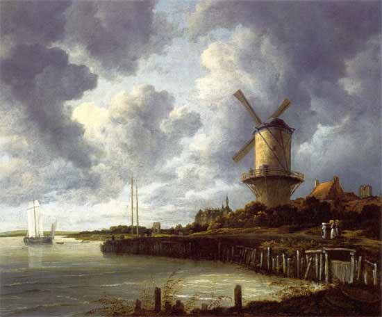 作品寓意:画家描绘的是典型的荷兰农村景色,风草萋萋,树影婆娑,水光云霓,抒发出一种安谧宁静的诗情画意。是一幅是具有时代典型意义的乡村磨坊的风景画。它是大自然的动力的颂歌,也是荷兰面粉工业发展的赞美诗。