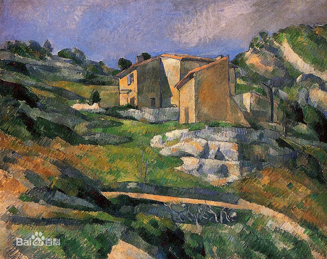 在平原上,塞尚用一块块深浅不同的绿色和橙色来展现屋子、蔬菜地和收割完的小麦地。