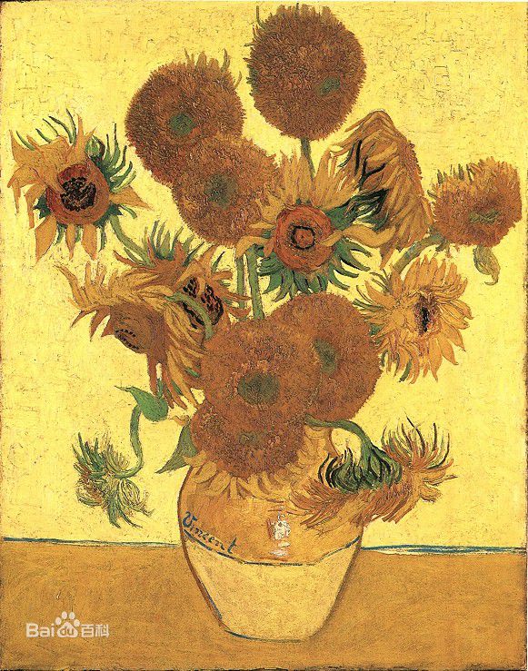 作品寓意:作品以饱满而纯净的黄色调,展示了画家内心中似乎永远沸腾着的热情与活力,那一团团如火焰般的向日葵,不仅散发着秋天的成熟,而且更狂放地表现出画家对生活的热烈渴望与顽强追求,那一块块炽热的黄色,不仅融集着自然的光彩,而且宣泄着画家对生命的尽情体验与永久激动。凡高虽然只活了37岁,但他的生活和艺术却始终保持着旺盛状态,即使穷困潦倒,也未扔掉那维系生命与精神的画笔。他画的向日葵不是自然的真实写照,而是他生命与精神的自我流露,是他以火一般的热情为生活高唱的赞歌。