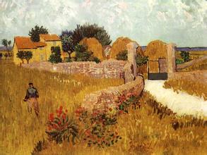 作品简介:描绘的正是这种地中海灿烂阳光下宁静的普罗旺斯农庄景色。一条乡村道路从画面的右下角把观众的目光引向了午后的普罗旺斯农庄的大门,延绵的矮墙一直延伸到了绿茵掩隐下的黄色农屋,画面左侧是正在劳作的农夫,背景中蓝色的天空飘浮的薄云带着玫瑰的粉色。强烈的阳光似乎被天空中的薄云遮掩了,散射的阳光没有在地面留下影子,使画面更加柔和与宁静。向前方延伸的矮墙下长着不知名的植物,伸展的绿叶衬托出的红色花朵使宁静的画面增加了几分生动。仔细看时,可以发现,那些花朵是用画笔直接将油彩点在画布上,从下层透出的色彩和在提笔时形成的堆积巧妙地构成了花瓣的纹理,更使花朵具有立体感。