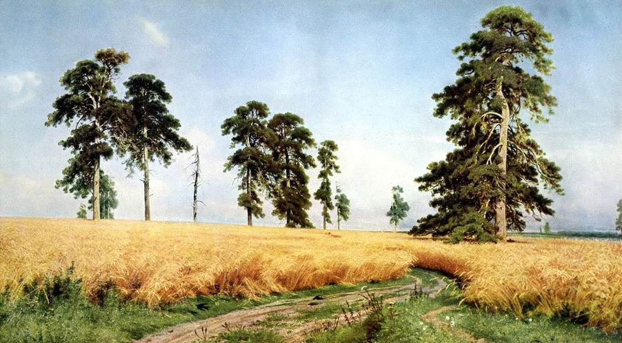 作品介绍:画中深沉醇厚的俄罗斯大地,金色的麦田铺向无际的远方,几株橡树在麦田间默言伫立,麦田中的车辙泥泞而不平,仿佛能听见马车驶过时留下的颠簸,默默伸向远处翻涌的云朵和草原。