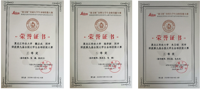 10月12-14日,第九届全国大学生金相技能大赛在山西太原举行,全国290所院校参加比赛,我院学生陆泽新获得二等奖,魏业成、朱玉锁获得三等奖。