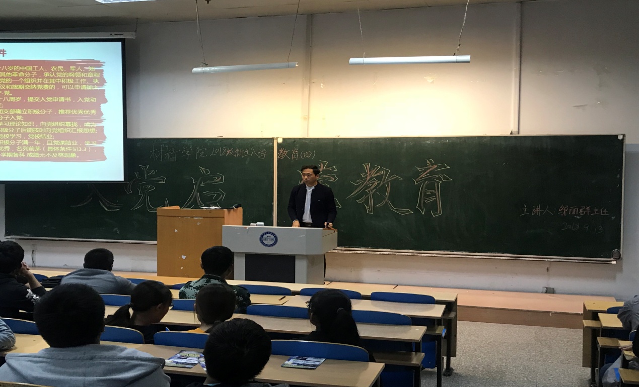 9月13日晚上,在主楼ES0303开展入党启蒙专项教育讲座。学工办主任邬丽群老师首先结合对于共产党的认识,阐述了如何端正入党动机,详细介绍了发展党员条件及发展党员流程。最后邬老师提出了三点希望:一是希望大家能够坚定理想信念,思想上积极向党组织靠拢;二是希望大家能够以党员的标准严格要求自己,仰望星空,脚踏实地;三是强化四个意识,增强四个自信,努力做一名社会主义建设者和可靠接班人