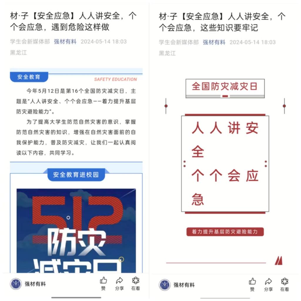 小小贴士传千里,安全应急入人心。学院通过公众号发布安全应急科普知识,班级负责人在群内分享安全提示语等形式,有效提升学生的安全应急知识水平,增强学生的安全防范意识,优化学生的安全素养。旨在掀起关注安全应急的热潮,确保安全教育工作真正深入学生心中,落到实处。