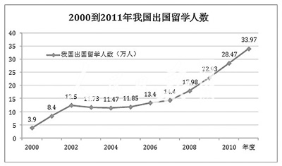 2001年中国加入WTO后,逐步与国际接轨,中国留学群体数量急剧上升,整体上呈现不断增长的趋势。据麦可思数据有限公司研究院执行院长郭娇介绍,2000年,中国出国留学人数3.9万人,而加入WTO当年,出国留学人数骤增至8.4万人。2011年,中国出国留学总人数为33.97万人,数量占当年全球留学人数的14%,为2000年出国留学人数的8倍,接近1978~2000年累计出国留学人口总和的34万人。