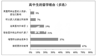 在有出国意向的被调查高中生中,排在首位的留学理由是“接受更好的教育”(67%)。相比于2011届本科毕业出国留学生的出国理由,高中生留学的理由更偏重于追求优质教育方面。