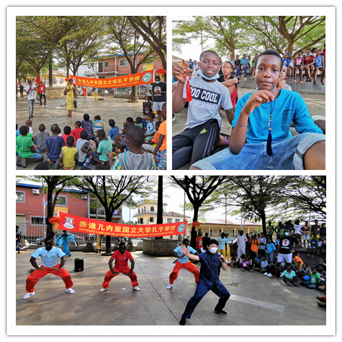 近日赤道几内亚国立大学孔子学院中外方院长率孔院师生30余人,走进马拉博市伊拉·恩格玛社区,为当地民众举办了一场精彩纷呈的中国传统文化体验活动。活动现场热闹非凡,社区及周边的民众带着孩子们闻讯而来,巡逻的警察一边维护秩序,一边也当起了观众。