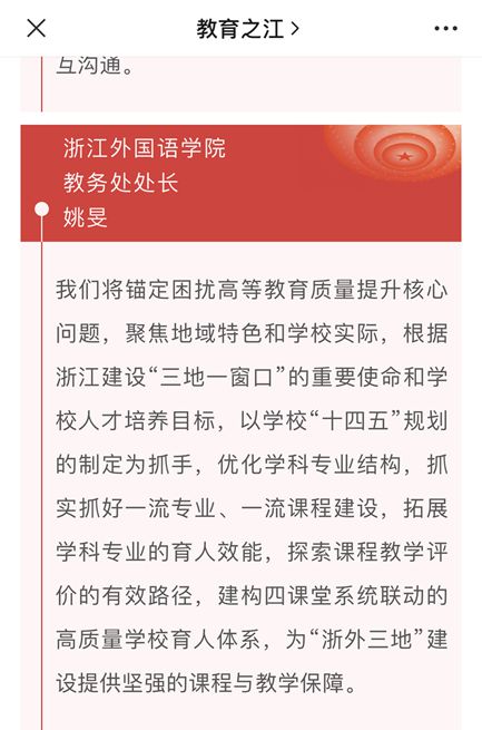 3月9日,“教育之江”公众号以《两会教育“关键词”,浙江师生有话说!》为题,报道了全省各地各校师生热议全国两会的情况。其中,提到了浙外教师结合自身工作、学习实际在“关于高质量教育体系”方面的思考。