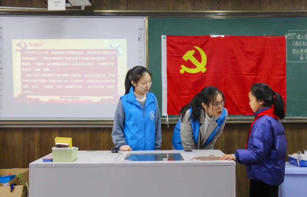 4月8日中午,杭州市留下小学红领巾学院主持人队的教室里静悄悄的,同学们安静地站立着一动也不动。挑战结束后,来自教育学院大学生志愿者给他们讲述这样一则静默的故事:“1950年11月朝鲜战场长津湖战役中,一排排中国人民志愿军战士俯卧在零下40摄氏度的阵地上,手握钢枪、手榴弹,保持着整齐的战斗队形和战斗姿态,仿佛是跃然而起的‘冰雕’群像,他们致死都在等待冲锋的号角……”“冰雕连”的故事把一颗颗爱党爱国的种子播撒在在场每一名小学生心中。