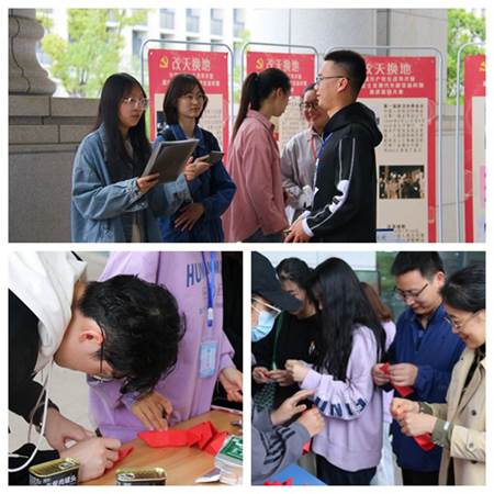 展览分为“开天辟地”、“改天换地”、“翻天覆地”和“感天动地”四个篇章,一张张展览图画,一个个党史故事,一曲曲红歌旋律,配合手折红船、党史地图知识问答、红歌接力和手写心语寄党情四个环节活动,让参观展览的师生从鲜活的党史中汲取了营养,在具体活动的体验中加深了思考。