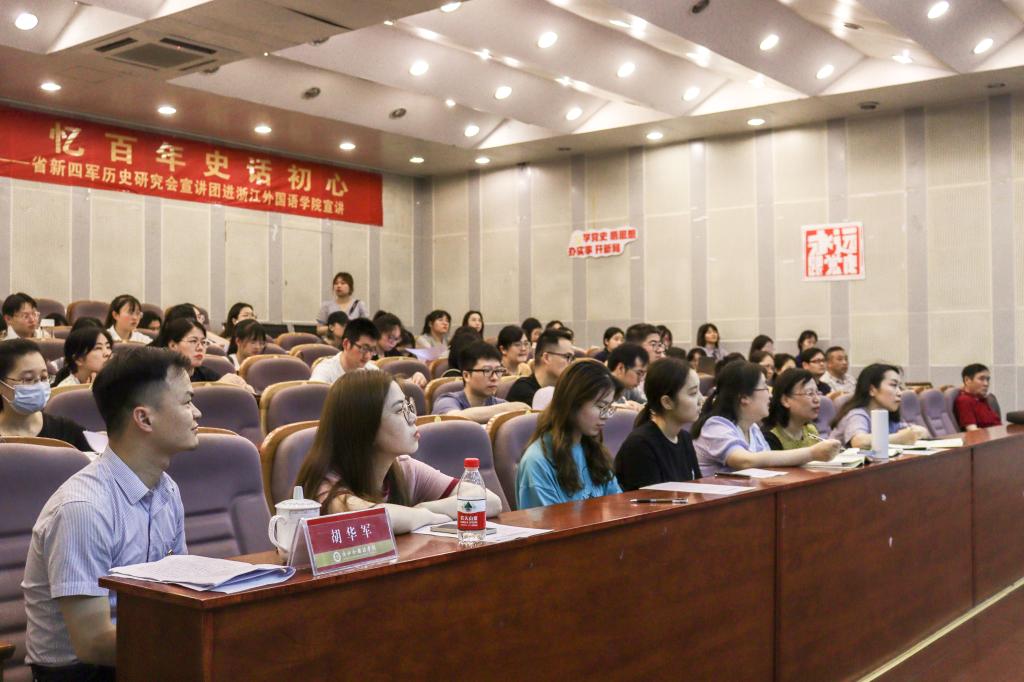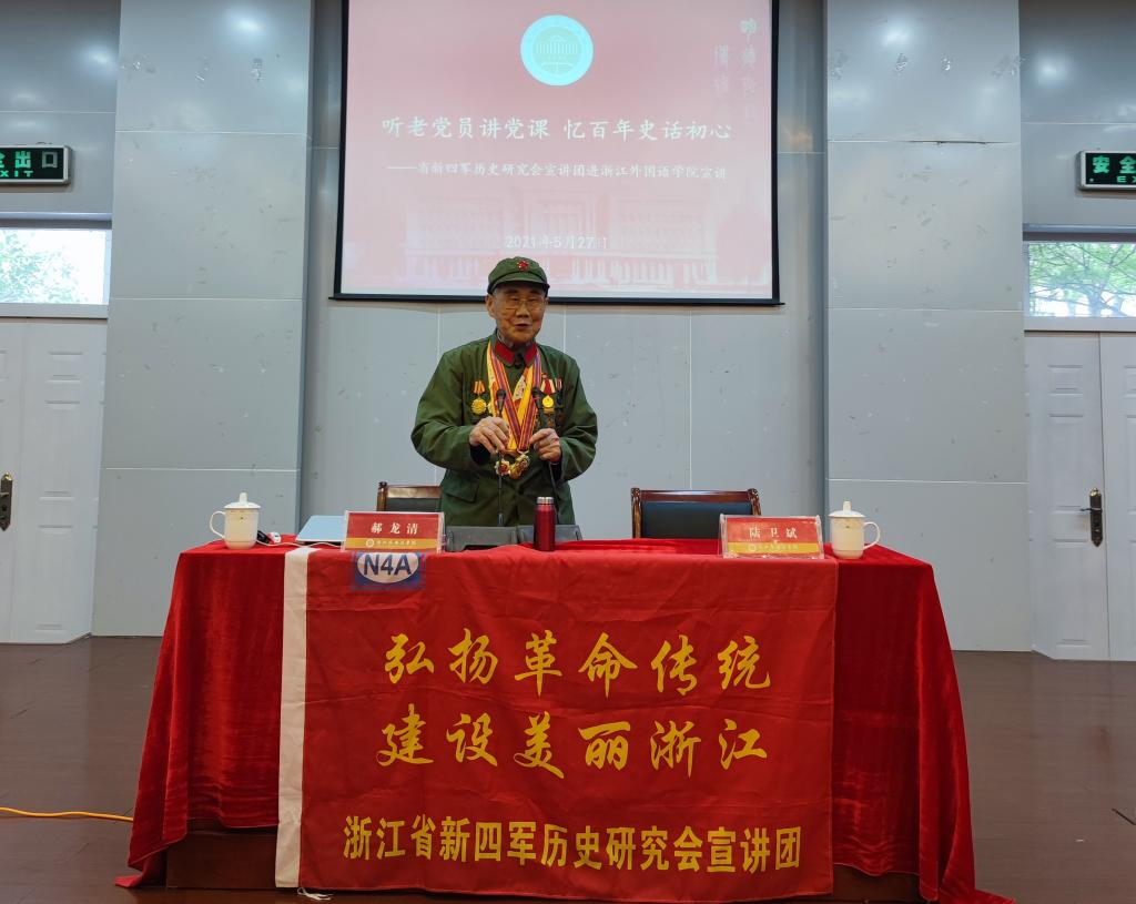 随着党史学习教育扎实深入开展,5月27日,教育学院、中文学院、图书馆邀请浙江省新四军历史研究会宣讲团进校宣讲党课。浙江省新四军历史研究会宣讲团常务副团长程宇航,92岁八路军老党员郝龙清分别作两场讲座。