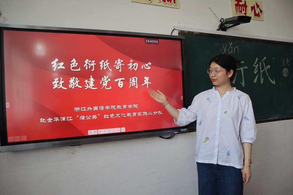 小分队为本次公益暑托教育服务活动准备了多样的沉浸式课程,有浦江传统文化体验课程、红色拓展性课程,以及农业基地实践、红军毅行等。在浦江传统文化课堂上,非遗剪纸传承人楼基洪手持金剪、口述妙招,“来,把纸这样叠过来,再在这里剪一剪……”在刀痕交错中,对称热带鱼、桃花、牡丹、“立”春等各式彩色剪纸栩栩如生。“哇!”“好厉害啊!”惊叹声一阵又一阵,孩子们近距离感受到了浦江剪纸的神奇魅力。浦江道情传承人傅兴德用浦江方言将传统故事娓娓道来,让孩子们在浦江方言特有的韵味中体悟蕴于弹唱间的浦江风土人情。