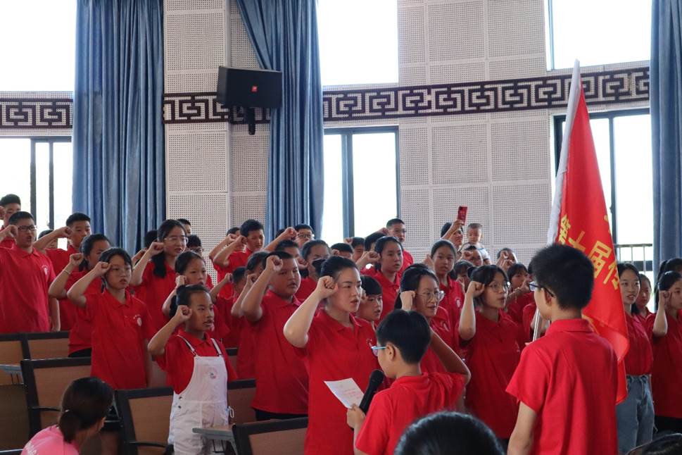 7月4日上午,杭坪镇中心小学“第十届传统文化夏令营”正式启动,当地53名学生及其家长共聚学校举行了开营仪式。中心小学校长楼基洪为实践队员代表授旗,并对团队表示欢迎。“承诺入营之后,听从指挥,认真学习,吃苦耐劳,保证完成此次夏令营的学习任务!”孩子们洪亮的宣誓声音久久在教室回荡。